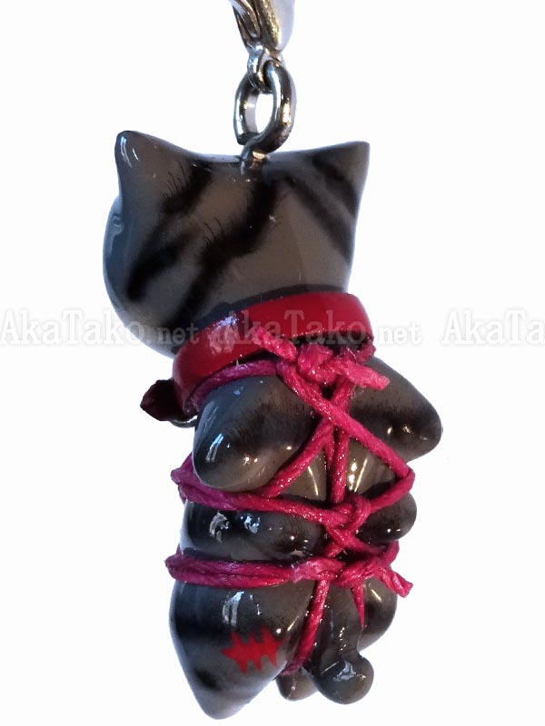 Gray house cat kinbaku charm. Kinbaku cell phone strap handmade in Japan and signed by the artist (in red on back). Comes on a paper display card as shown in second photo and has a lobster claw clasp to make attachment easier.