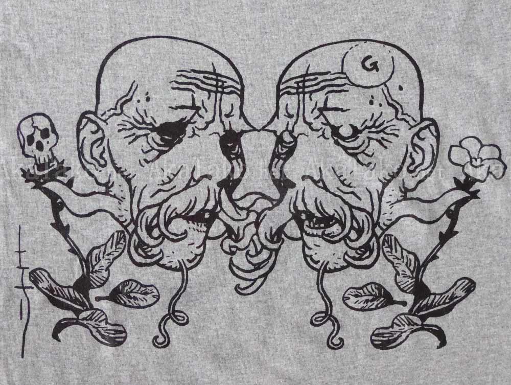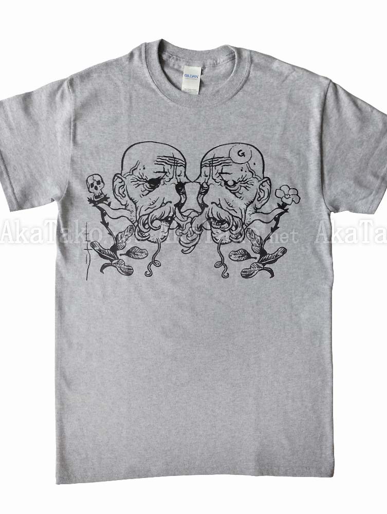 Brand new heather gray t-shirt with black print of Katsuya Terada's Ojiichan design - the heads of two old men float towards each other. Some leaves, a small skull, and a flower are in the background. Also available in green!
