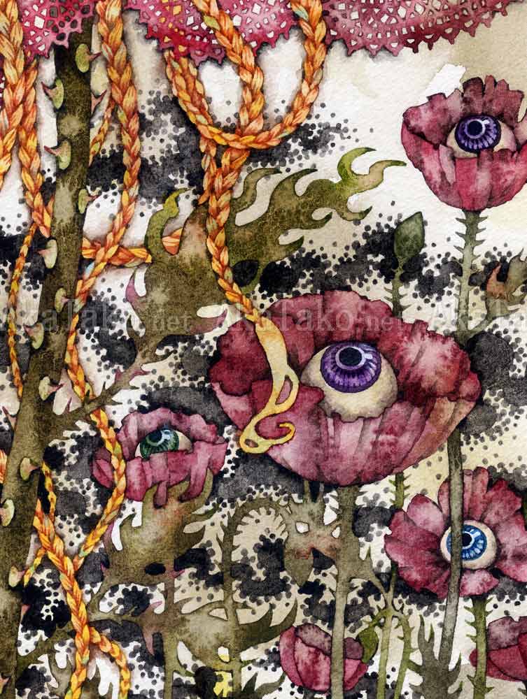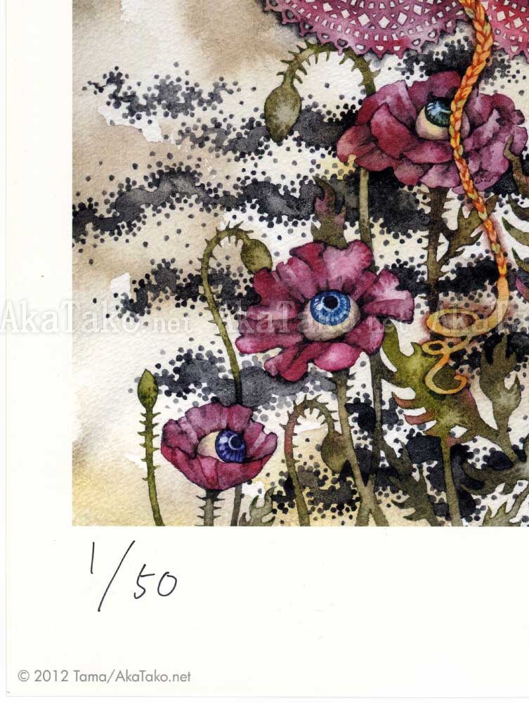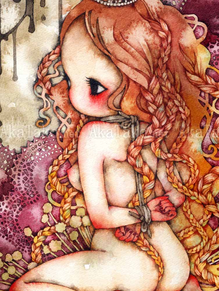 Brand new poster of "Maidenhood" by Tama. A girl sits in the middle of a large pink flower with her hair cascading to the ground in several braids. Her hands are tied behind her back and other flowers look up towards her as a dark sky drips down. Recently published in Tama's new book "Lost Garden".