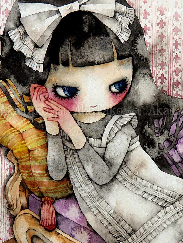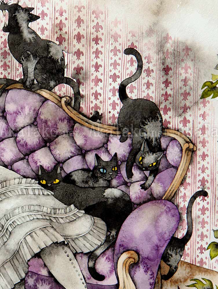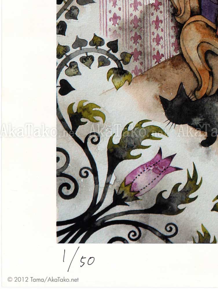 Brand new poster of "Servants for Me" by Tama. Originally published in the book "Under the Rose", a black haired girl lounges on a sofa in a ruffled dress with matching hair bow. Seven black cats prowl around and she clasps her hands in delight.