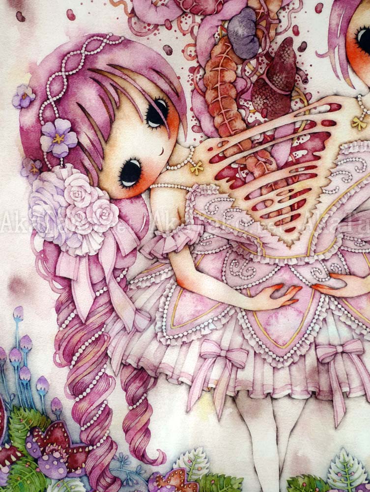 Special collaboration between Tama and AkaTako.net ! 100% silk art scarf of Tama's "Overflowed" artwork but heavily modified to fit into the square format. A pretty ballerina has two heads with long rosy curls. Her body splits vertically in the center and a plume of entrails drift towards the heavens. Carnivorous flowers with spiky teeth and big green leaves surround the edges. Published in "Calling" book or as a postcard.