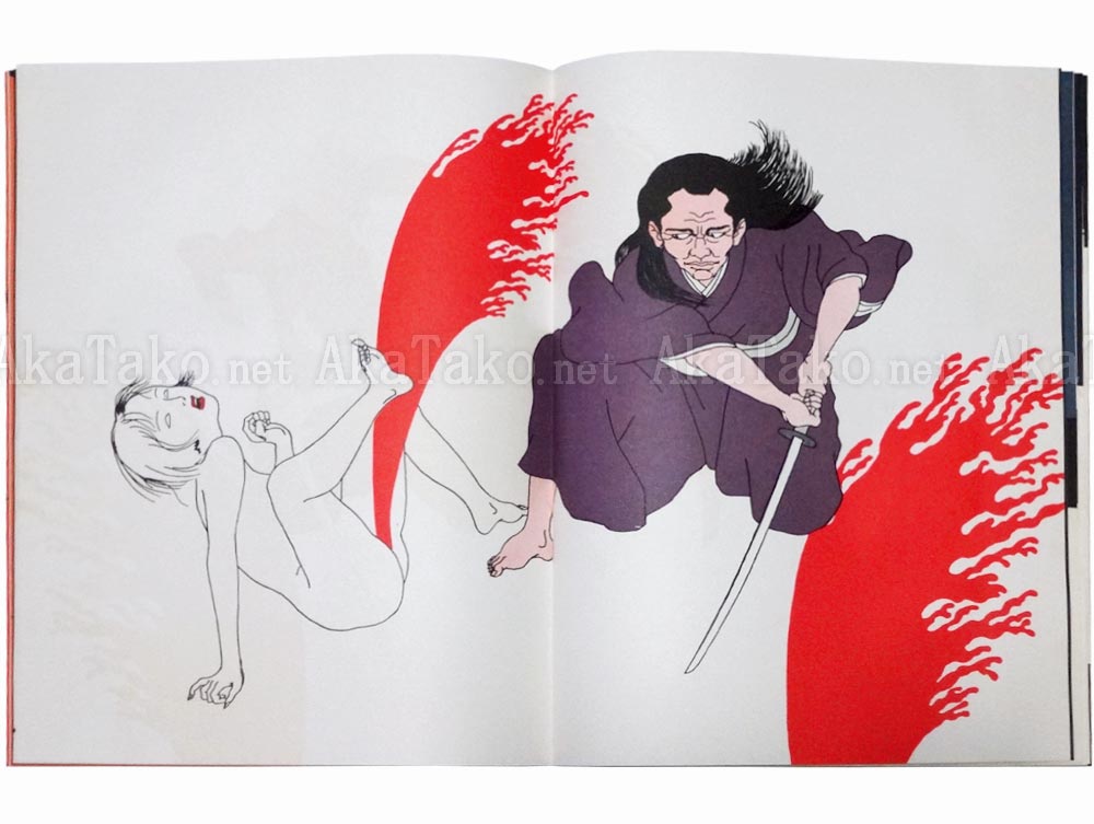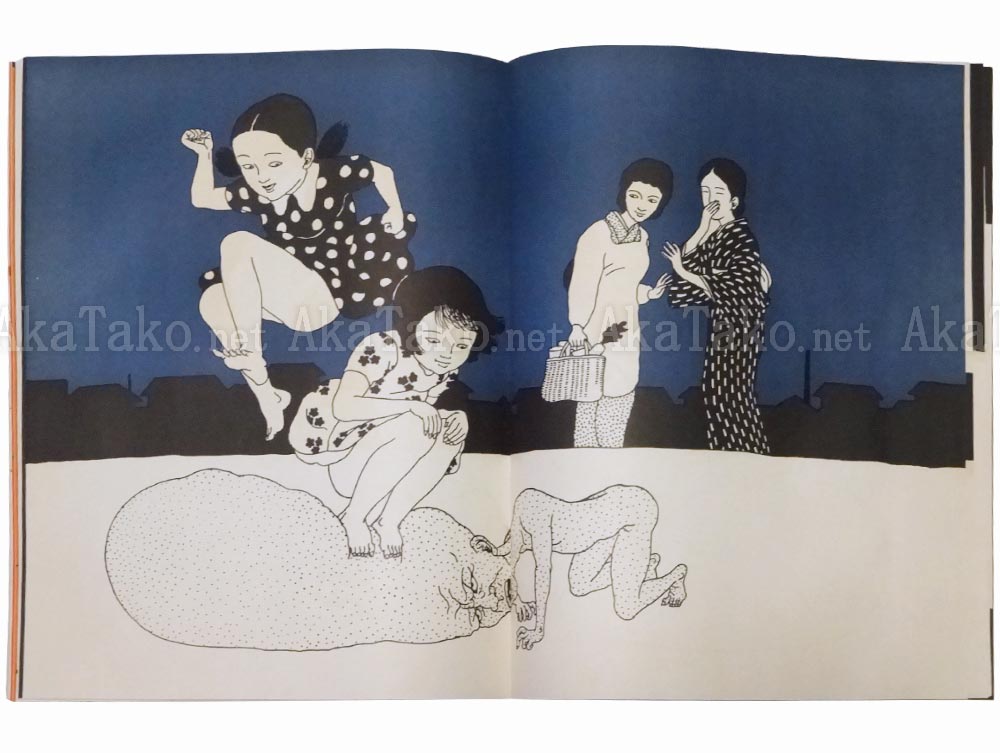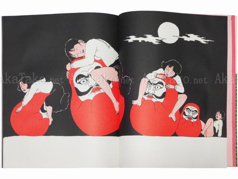 Long-necked ghosts, slashing samurais, decapitated mothers, excited school girls, camellias, chrysanthemums, and blowing leaves - all coming together in an eroguro vision unique to Toshio Saeki. The original first edition printed in 1972, there are 51 prints - each stretches across two pages and has a limited color palette.