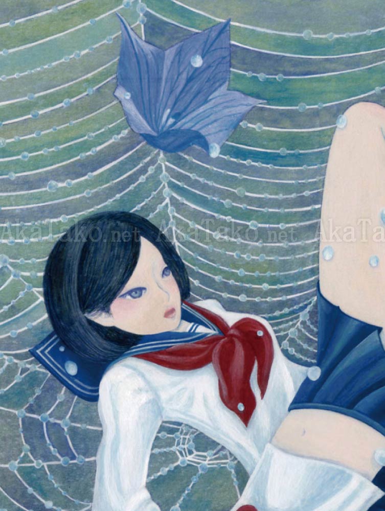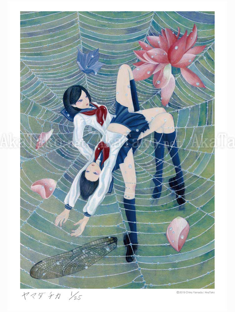 A dewy spiderweb has caught two schoolgirls, some large flowers, and a single dragonfly wing. Brand new, original giclée print is hand SIGNED and NUMBERED limited edition of 25 pieces. Was also reproduced in her "Hyou Hyou" book.