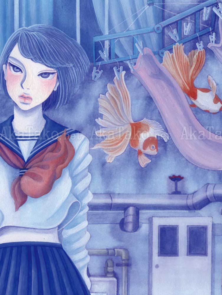 Original painting by Chika Yamada of a surreal street scene. A Japanese school girl stands in front of pipes and meters while a laundry drying rack holds towels and goldfish swaying in the breeze.