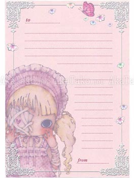 Stationery set featuring "Longing Energy" by Tama. A sweet girl is dressed all in pink with bandages on her arms and a big eyepatch with a heart in the center.