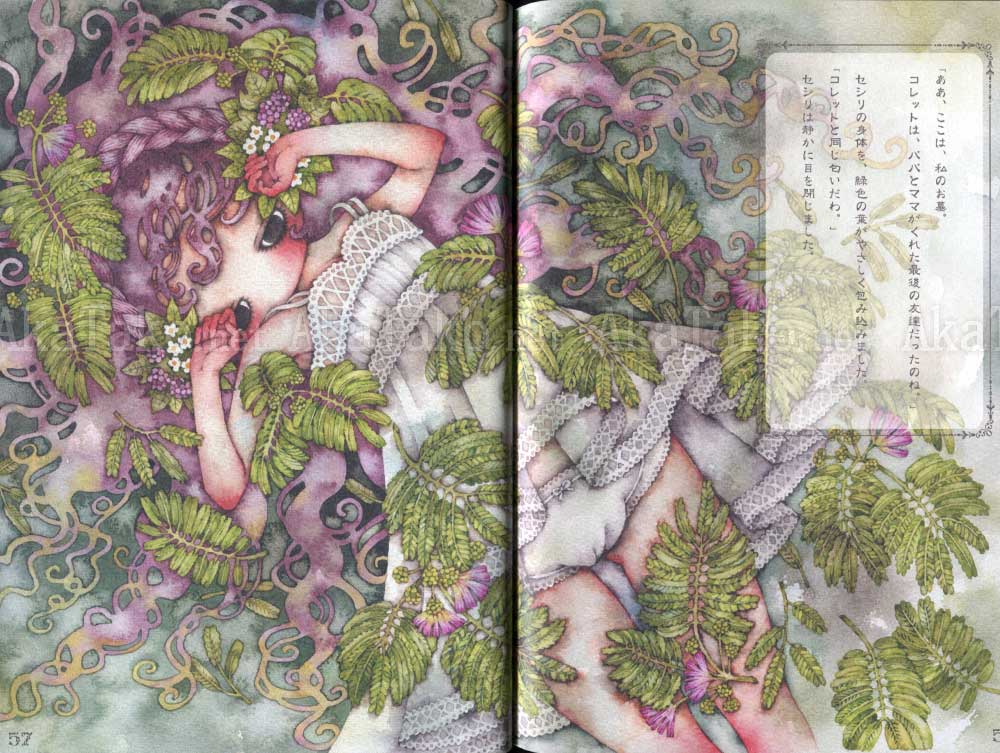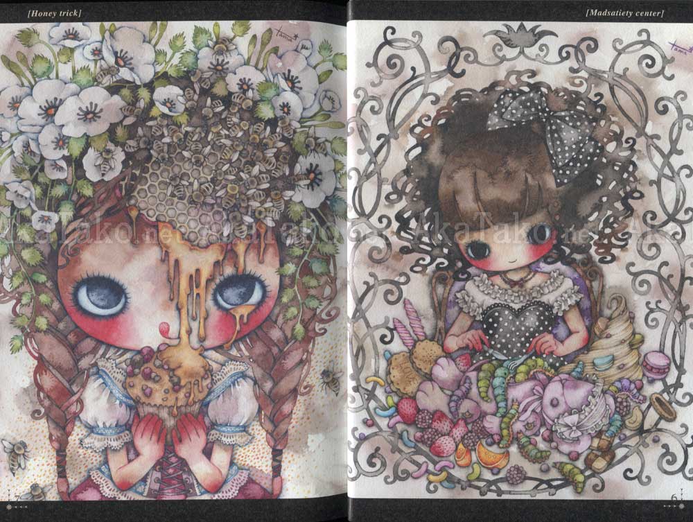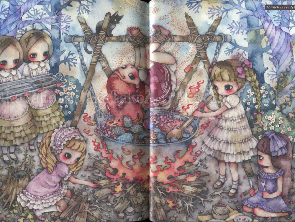 The cutest book I've seen in a while - Tama's "Lidocaine Drop" is full of watercolor paintings of sweet yet twisted little girls with curly hair and innocent looks on their faces - but don't be fooled! They're ready to cook you up for lunch, plant you in the garden, or play mean games with you.