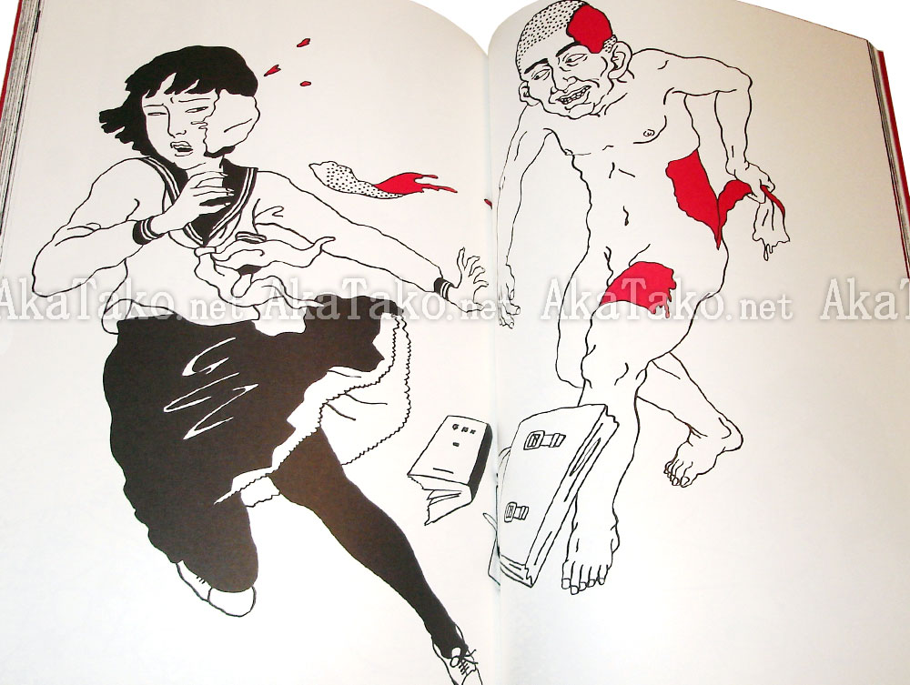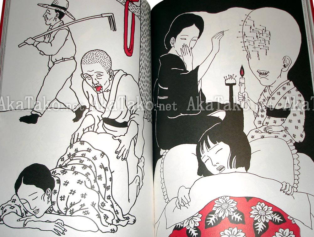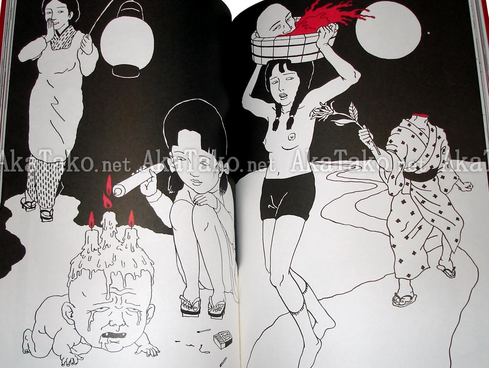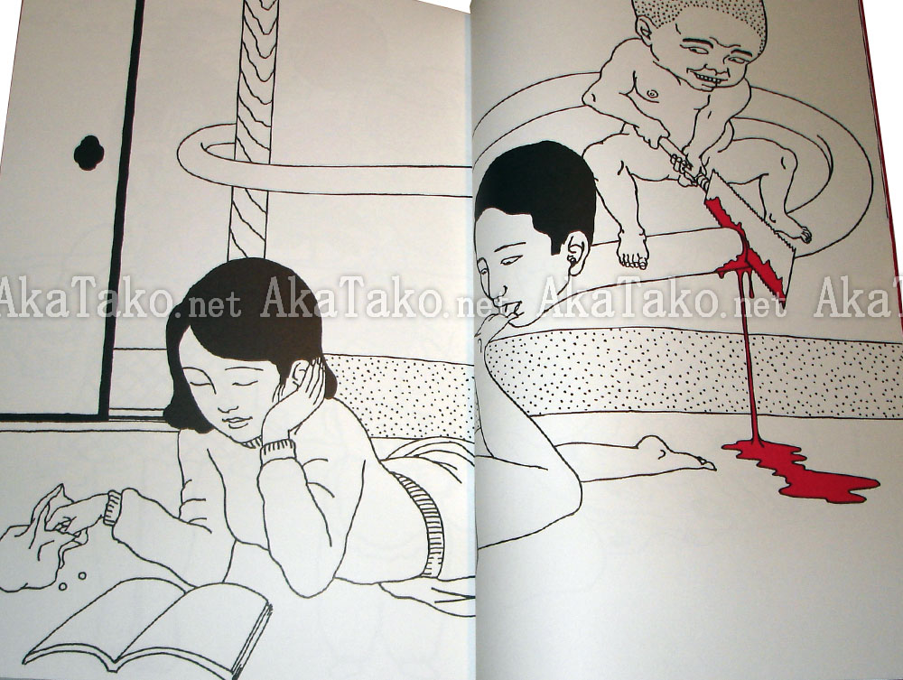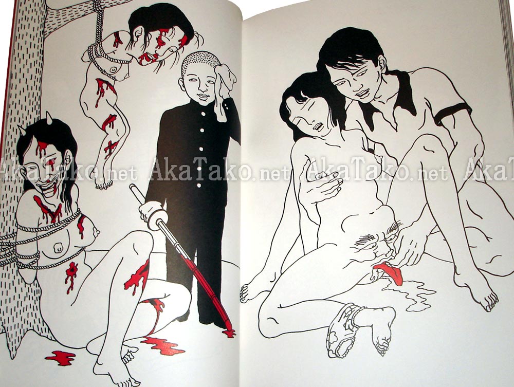 Large format softcover book by Toshio Saeki features a collection of his S&M inspired works printed in black, white and red. Comes in a cardboard sleeve. I'm not sure about the translation of the title - could be "Prison Omission Works" or "Prison Works"? Only two pages of text (in Japanese) and every single other page is an eroguro print.