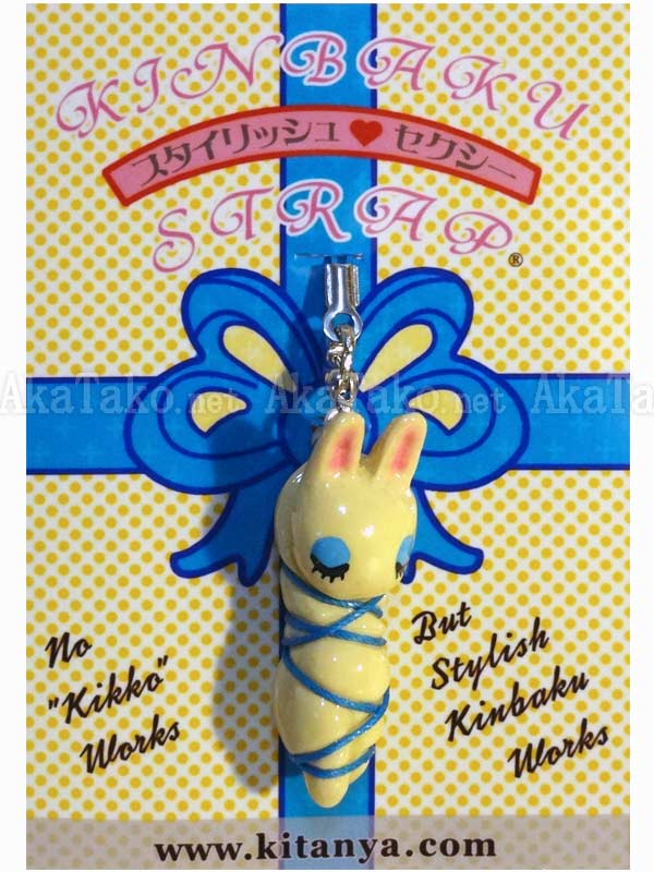 The white bunny has nothing to hide in this irregularly tied pattern of blue rope. Kinbaku cell phone strap handmade in Japan and signed by the artist (in red on back). Comes on a paper display card as shown in second photo and has a lobster claw clasp to make attachment easier.
