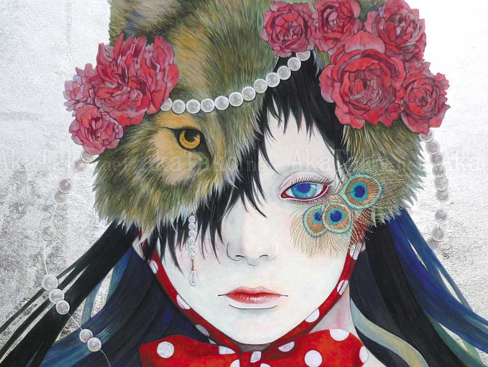 Brand new limited edition poster of Akiko Ijichi's "It Shows How Wicked I Am" painting which was printed in her book "Ilusion". A dark haired girl wears part of a wolf head on top of her head tied with a red and white polka dot bow. Dark pink flowers, peacock feathers, pearls, and a thin snake decorate her headdress.