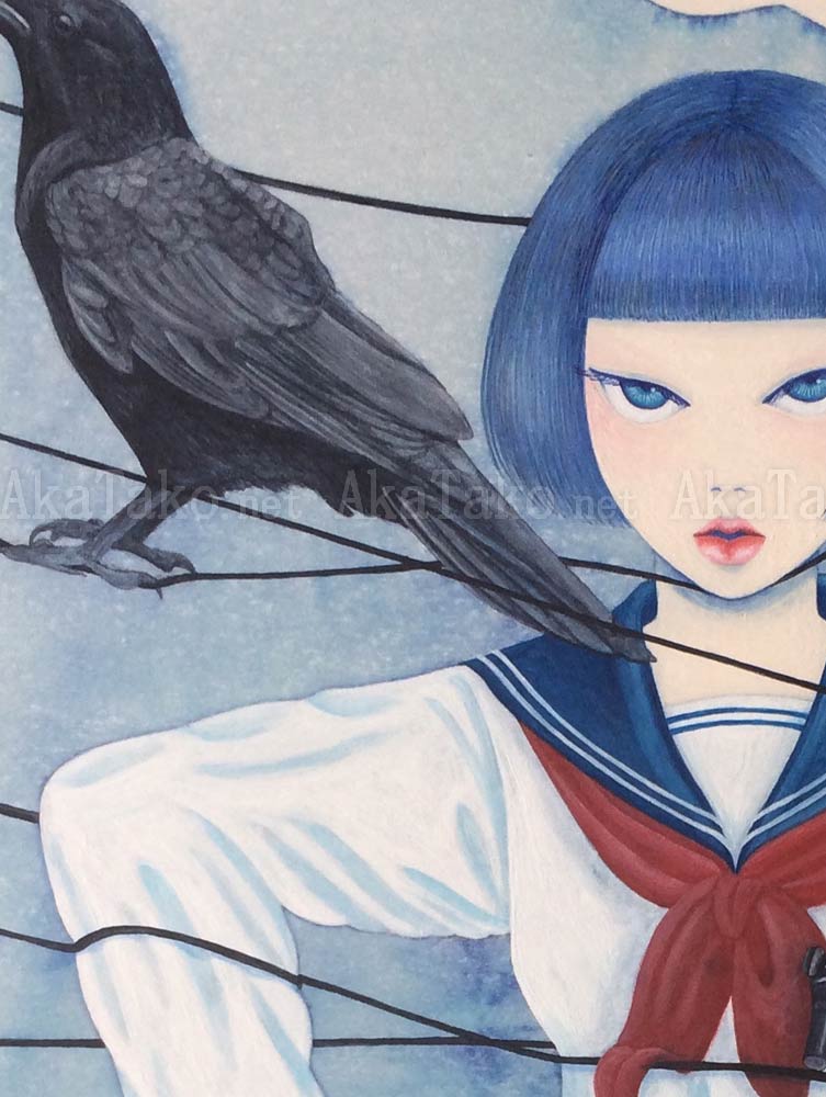 Original painting by Chika Yamada of a Japanese school girl caught in a mess of horizontal wires. A large black crow rests near her head. A red bicycle, and laundry drying rack are also tangled in the wires.