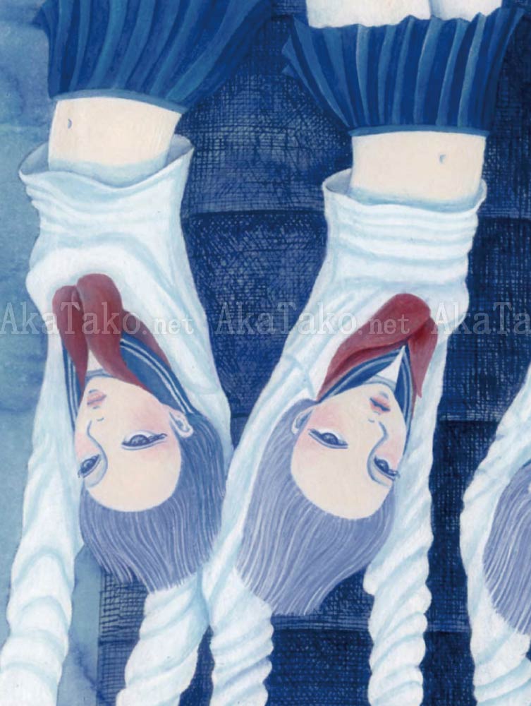 Three schoolgirls hang upside down from the top of a very tall smokestack. A bit of blue haze hangs in the background as their skirts defy gravity. Brand new, original giclée print is hand SIGNED and NUMBERED limited edition of 25 pieces.