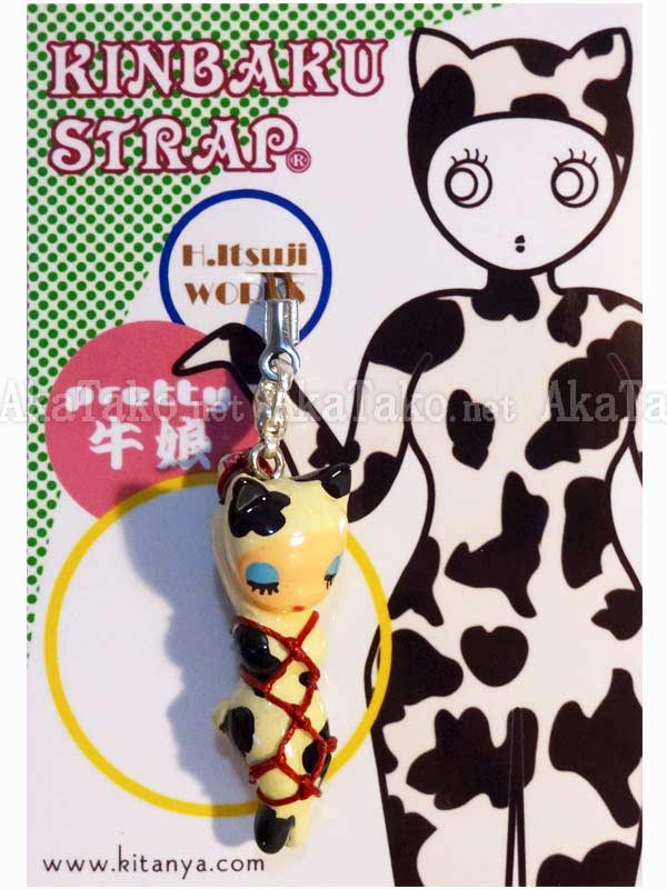 Pretty lady wears a black and white cow outfit and hangs from her hands as she is tied up in Japanese rope bondage. Kinbaku cell phone strap handmade in Japan and signed by the artist (in red on back). Comes on a paper display card as shown in second photo and has a lobster claw clasp to make attachment easier.