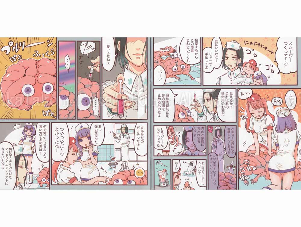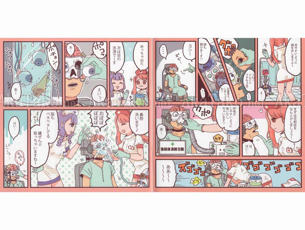 Mini comic with two cheery nurses, two doctors, and several yokai who do their best to fix up defective brains and make them shiny and healthy. Text is 100% Japanese.