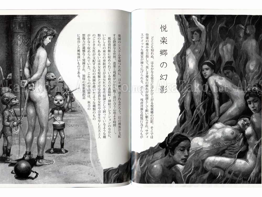 Explore a world of erotic fantasies ranging from surrealism to magic, S&M to spanking, and much more. This is the first book in the series "Fuzoku Shiryoukan Hizouga Senshuu" (風俗資料館 秘蔵画選集1) which loosely translates to "Sex Industry Archive of Treasured Images". Artwork is by two artists: Ran Akiyoshi (秋吉巒), and Aya Shijo (四条綾).