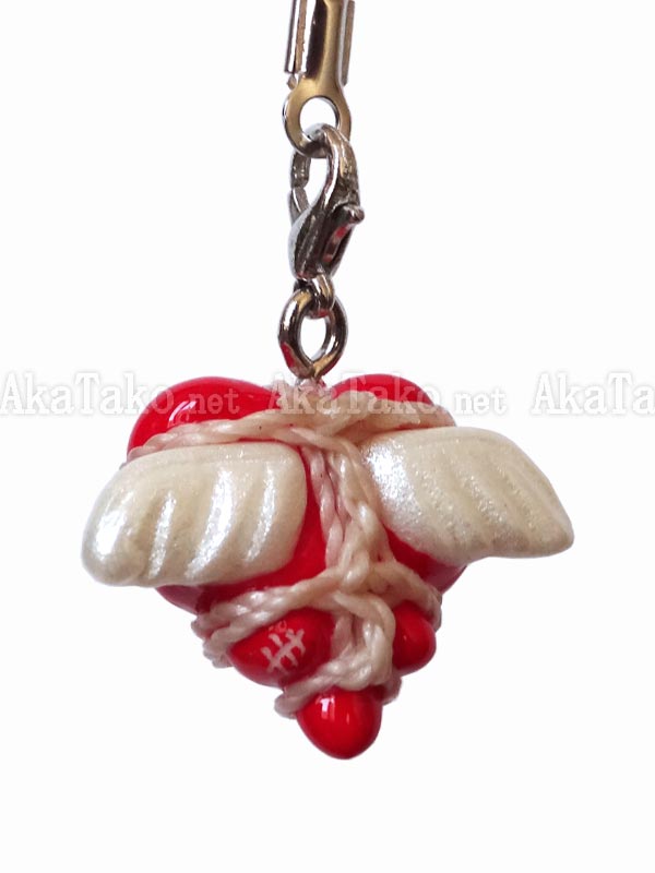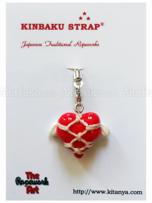 Bright red heart with metallic white wings is wrapped up in the bonds of love! Kinbaku cell phone strap handmade in Japan and signed by the artist (in white on back). Comes on a paper display card as shown in second photo and has a lobster claw clasp to make attachment easier.