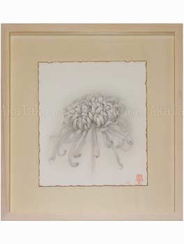 Original artwork by Fuco Ueda is a wonderfully detailed pencil drawing of a chrysanthemum. A tightly curled bunch of petals levitate above long tendrils against a hazy background. Framed in a floating shadow box.