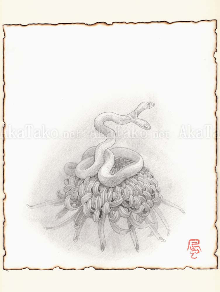 Original artwork by Fuco Ueda of a double-headed snake resting on top of a beautifully detailed chrysanthemum flower. Framed in an antique white wood frame from Sekaido. Background mat panel is natural/off-white color. Drawing paper is white.