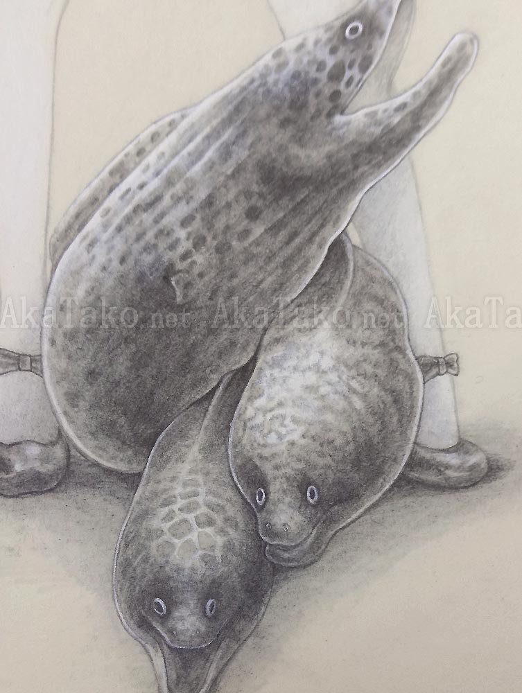 Original artwork by Fuco Ueda of a girl with some special friends. Three moray eels rest between her feet. Float framed in a light honey wood frame with a depth of about 1cm. Background mat panel is natural/cream color. Drawing paper is natural/cream color.