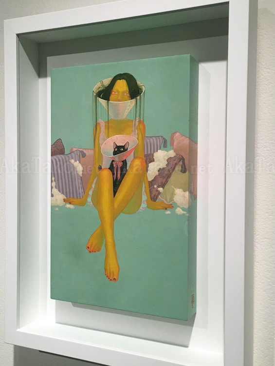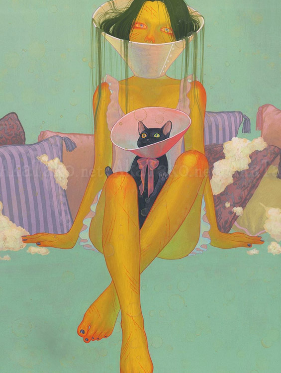 Original painting by Fuco Ueda of a naughty kitty and owner. Both of them wear plastic cones around their necks to help heal their wounds. Scattered pillows behind them have suffered too! Cotton stuffing spills out of the pillows but they are still fluffy.