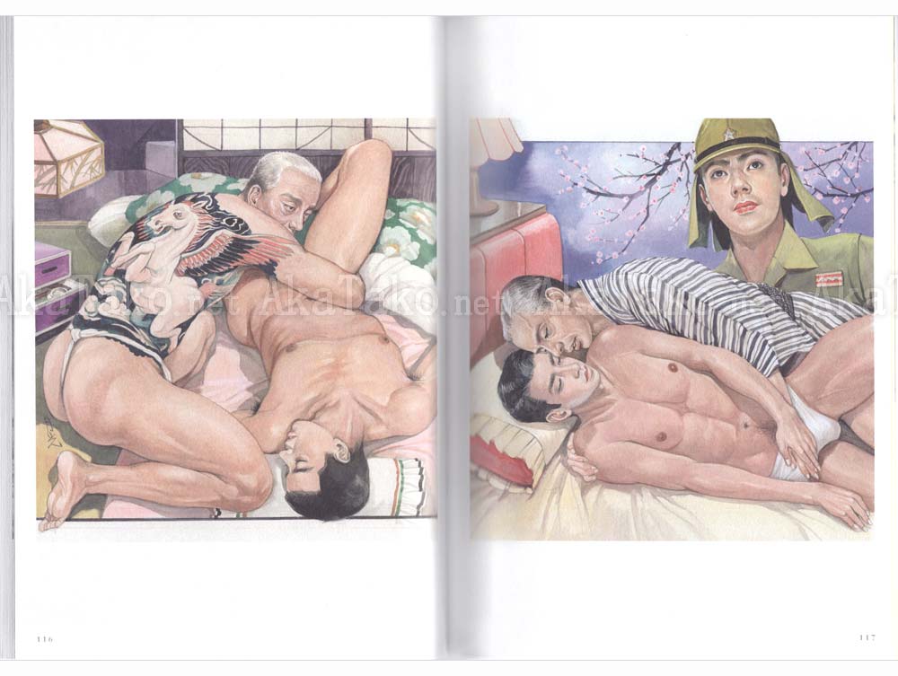 Book is divided into eight sections: Play Mate, Kinky Chic, Muscle Man, Erotic Fantasia, Mature Love, Samurai Love, Gekko Theatre, and Homme Fatale. Gekko Theatre includes illustrations of real-life stories which he collected from a telephone hotline he set up at his workplace to hear readers' experience and give consultation (Japanese text only).