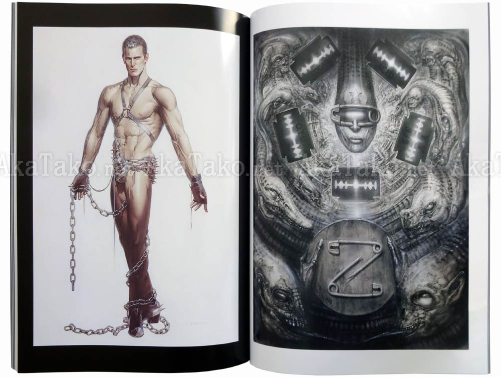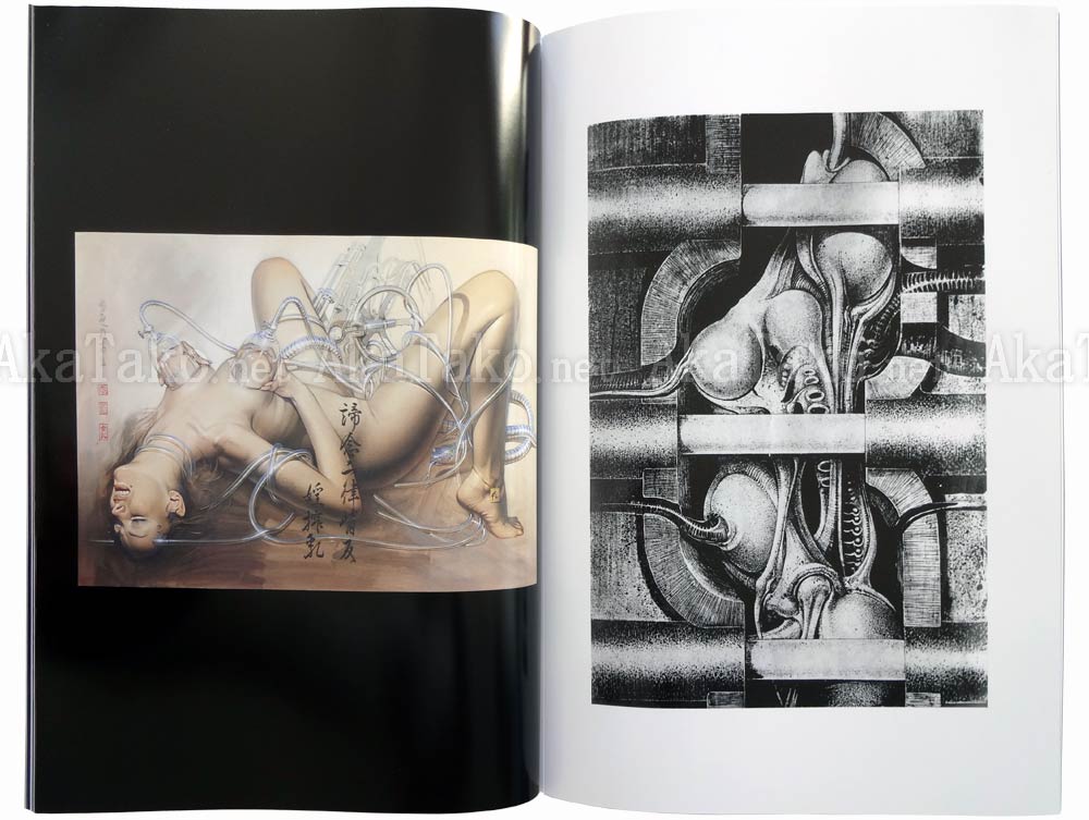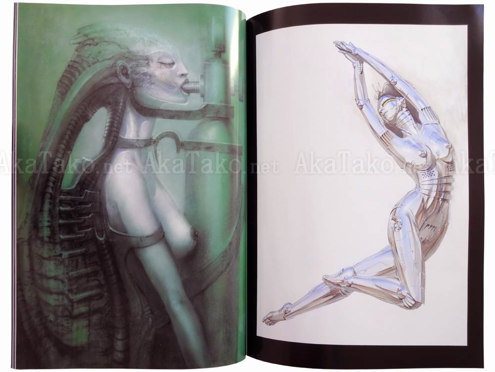 Book includes ~60 artworks, a double-sided (folded) poster of the front and back cover (19.7" x 27.56" 50x70cm), two die-cut stickers (one Giger, one Sorayama), and a section of black and white pages for artwork information, essays by Alessio Ascari, Venus Lau, HR Giger interview by Hans Ulrich Obrist and Patrick Frey, and Hajime Sorayama interview by Alessio Ascari. English/Japanese text