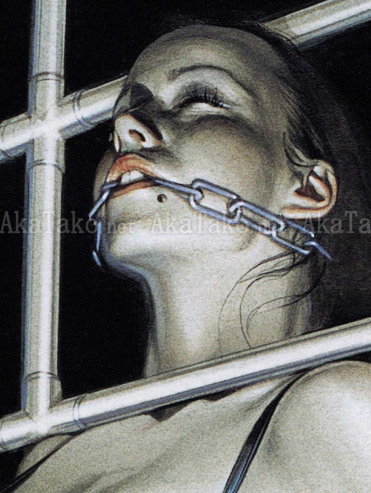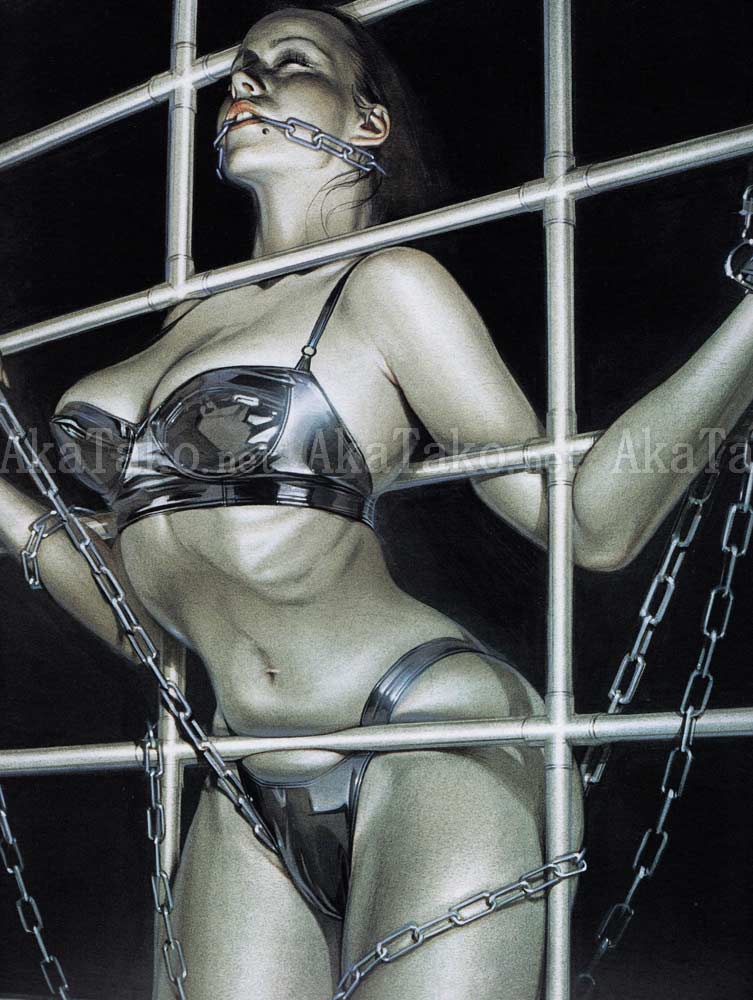 Vintage dead stock oversized print of pin-up artwork by Hajime Sorayama from the 1990s. A woman is trapped and bound up in a grid of silver tubes. Chains wrap around her body and across her mouth. She wears black high heels and shiny black lingerie.