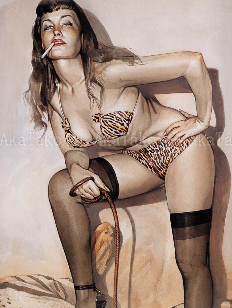 Vintage dead stock oversized print of pin-up Bettie Page with a docile tiger by Hajime Sorayama from the 1990s. She wears a leopard print bikini and black thigh high stockings. She holds a whip in one hand and a cigarette dangles from her mouth. One of her high heels rests on the reclining tiger's exposed crotch.
