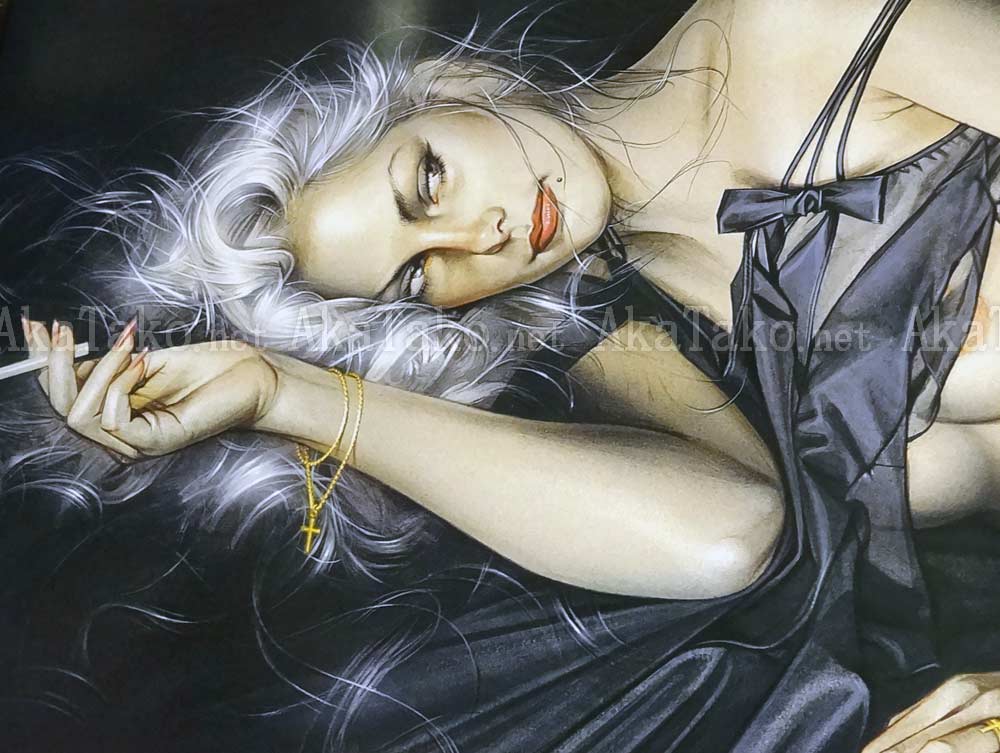 Extra-large poster featuring pin-up artwork by Hajime Sorayama. A blonde woman in sheer black lingerie smokes a cigarette. She lays on black sheets which fade off into the darkness and wears a cross ring and bracelet.