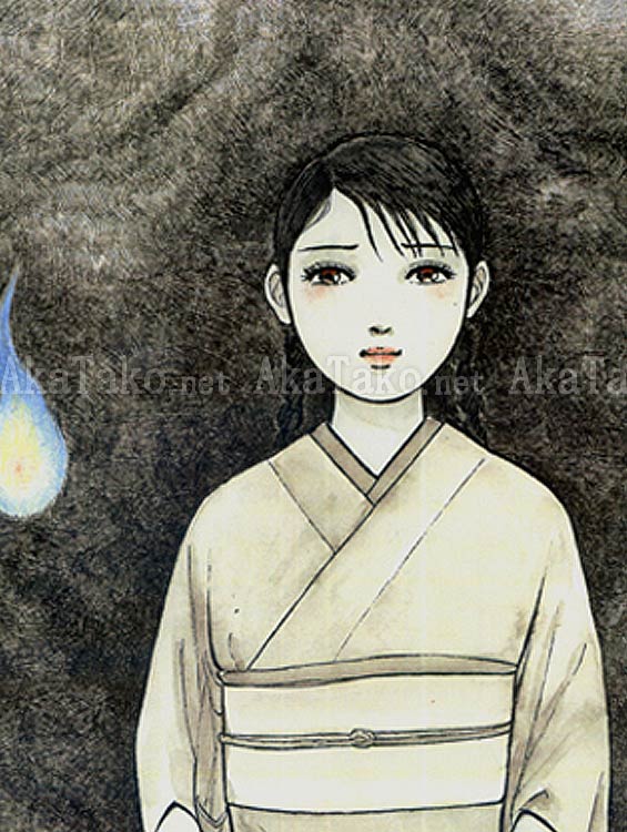 Original artwork "If There Are Warm Feelings" by Jun Hayami of a young girl with her hair in two braids. She is holding her kimono open with her hands to expose the lower half of her body.