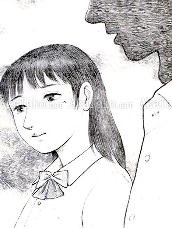 Original artwork "Love?" by Jun Hayami of a young girl wearing a school uniform. She is walking with a man who is in shadow in the foreground. There is a mountain and some trees in the background. She wears a mysterious smile.