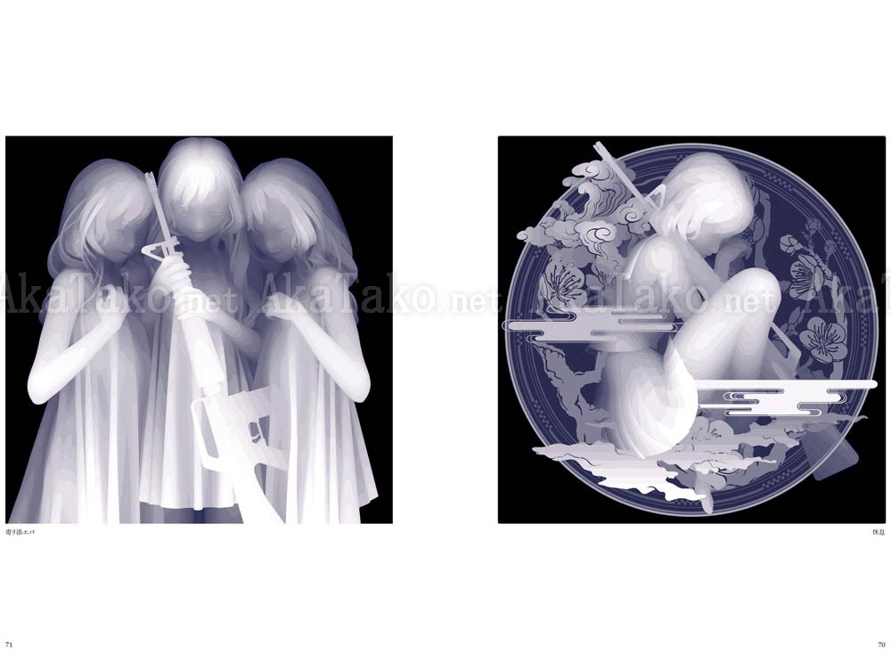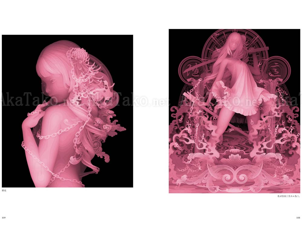 Ephemeral monochrome girls created through his own unique process combining digital and acrylic painting. Their smoothly outlined forms seem to glow from out of the pitch black darkness, depicting beauty, violence, death, struggle, innocence, etc. Examine the layers up close when you hold the book in your own hands.