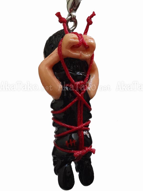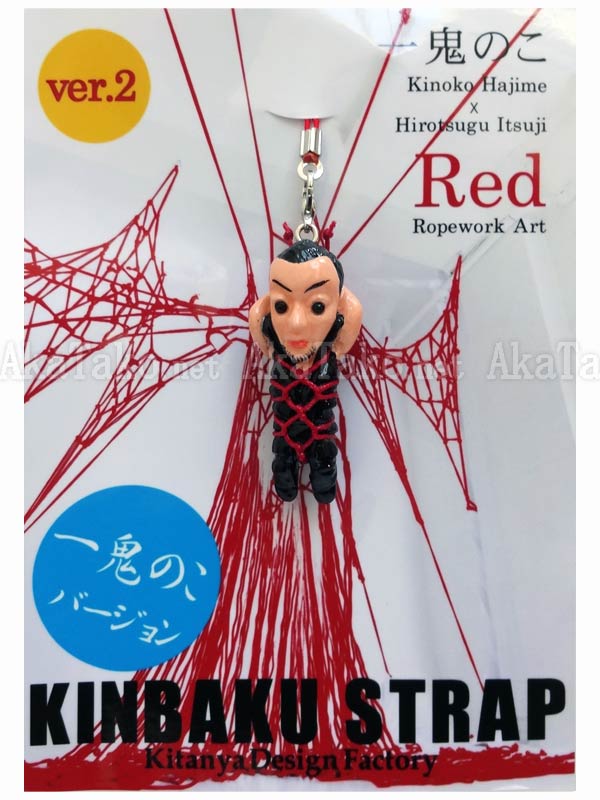 Issued only during the "Red" exhibition in Tokyo, this cell phone charm features Hajime Kinoko tied up in red hope with hands behind his head. Kinbaku cell phone strap handmade in Japan and signed by the artist (in red on back).