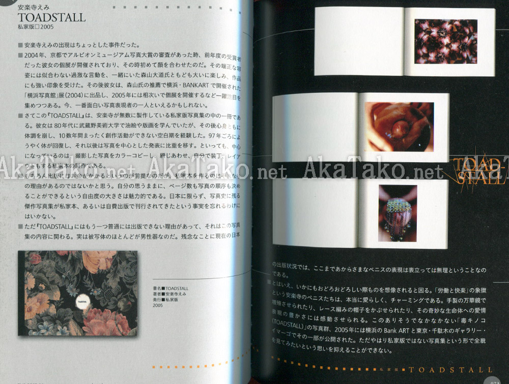 Most are a photo of the front cover, a description in Japanese and one or two thumbnails of inside pages. There are also some full page articles and photographs. Most notably a 15 page spread on Slawomir Rumiak's book "The Love Book: The Best of My Dreams" with full page black and white photos.