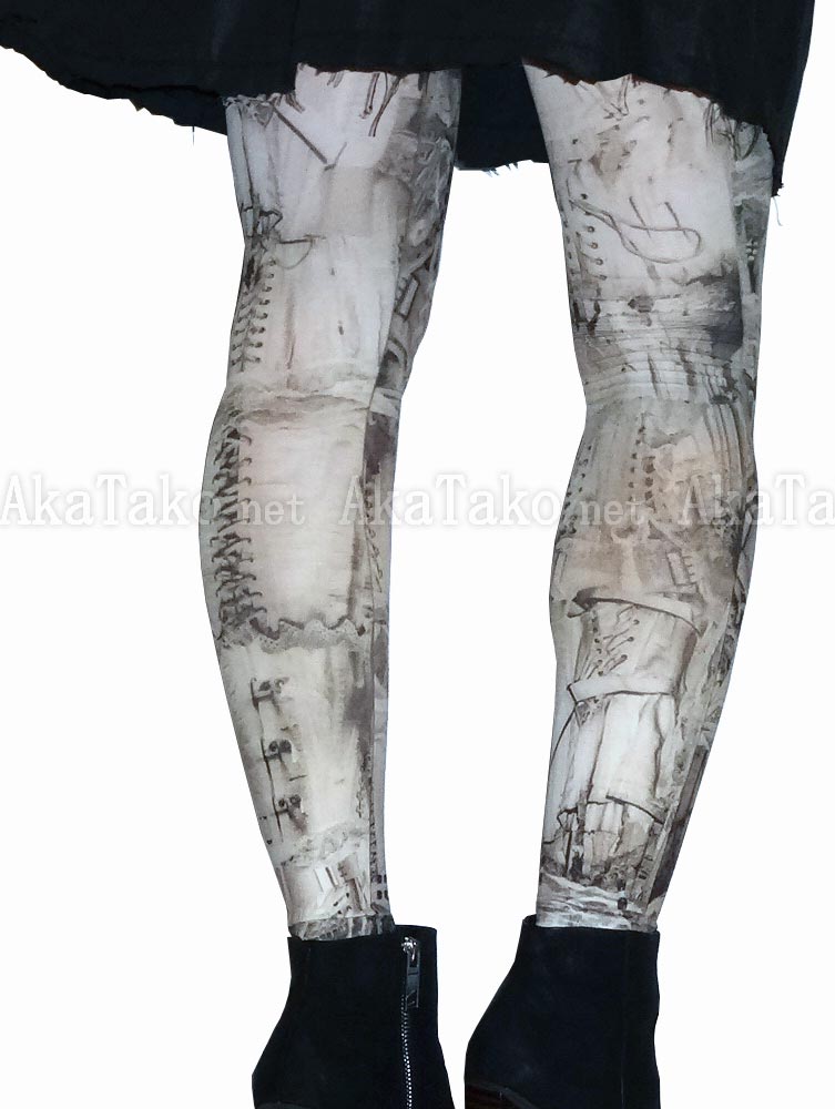 Footless tights featuring vintage medical corsets are a design collaboration between Lhiannan and Shee. All of the straps, buckles, and laces you could ever hope to fit on your legs! Gray-scale tone. Can be worn frontwards or backwards.