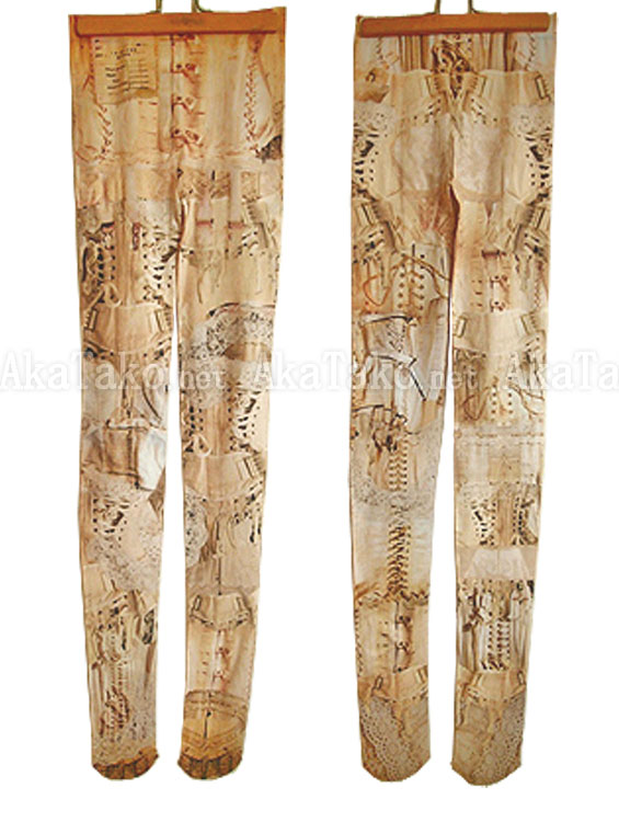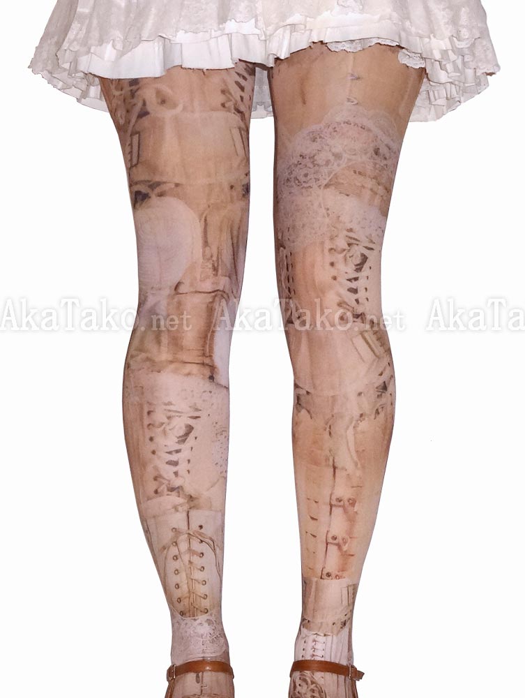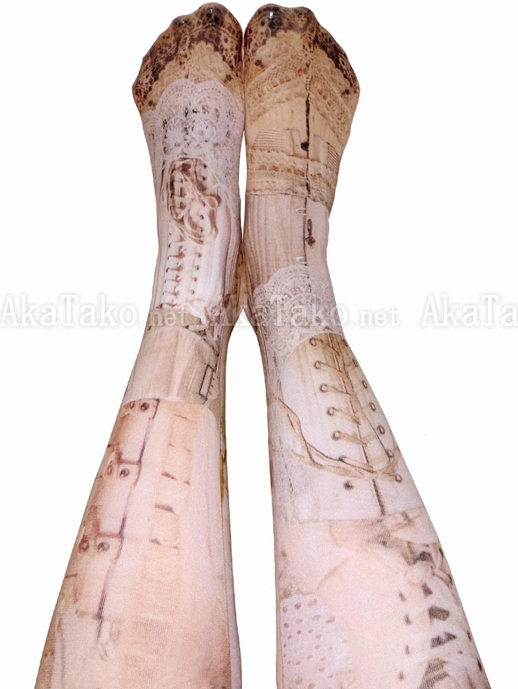Footed tights featuring vintage medical corsets are a design collaboration between Lhiannan and Shee. All of the straps, buckles, and laces you could ever hope to fit on your legs! Brown, natural, and blush tones. Can be worn frontwards or backwards.