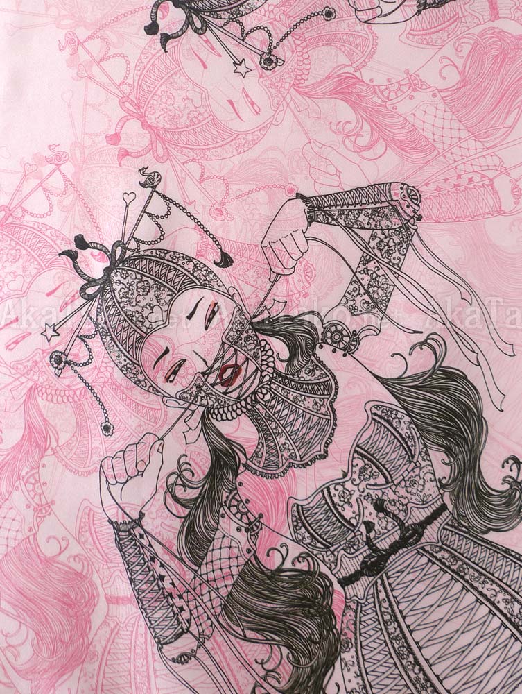 Special collaboration between Makiko Sugawa and AkaTako.net ! 100% silk art scarf of Makiko Sugawa's artwork "Lace-Up Dress". The original black and white drawing of a girl with mechanically attached arms. Her dress is an intricate criss-cross of laces and bows, all the way up to the face cover corset over her mouth! Previously unpublished.