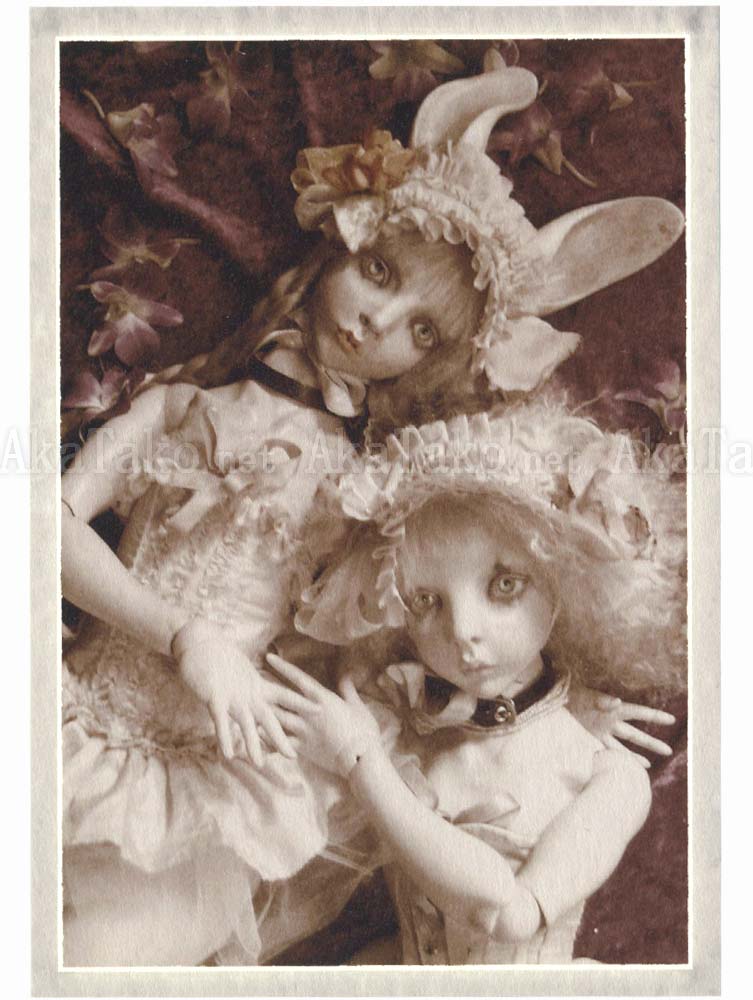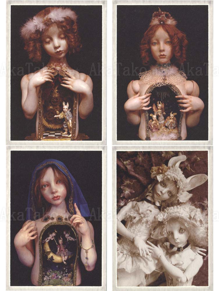 Set of four postcards by Japanese contemporary doll maker Mari Shimizu. Three of the cards feature her iconic "scene within chest" dolls. A beautiful ball-joint doll has her chest cut open to reveal an intricate three dimensional scene placed inside. The last card features two ball-joint dolls in white costume.