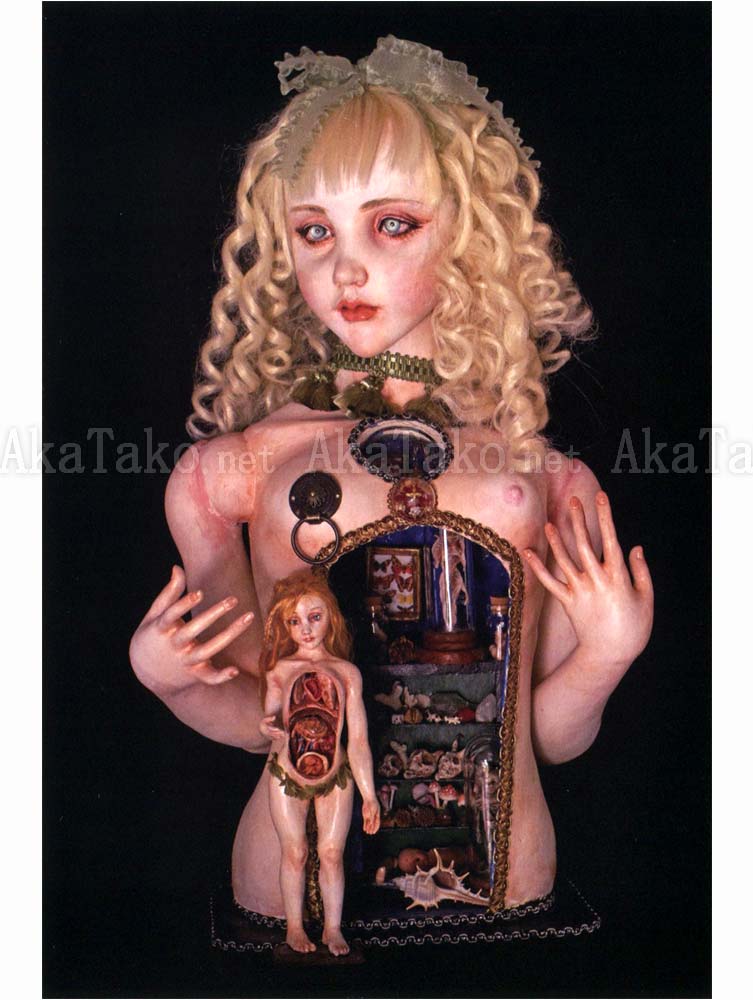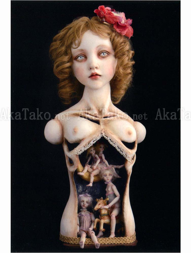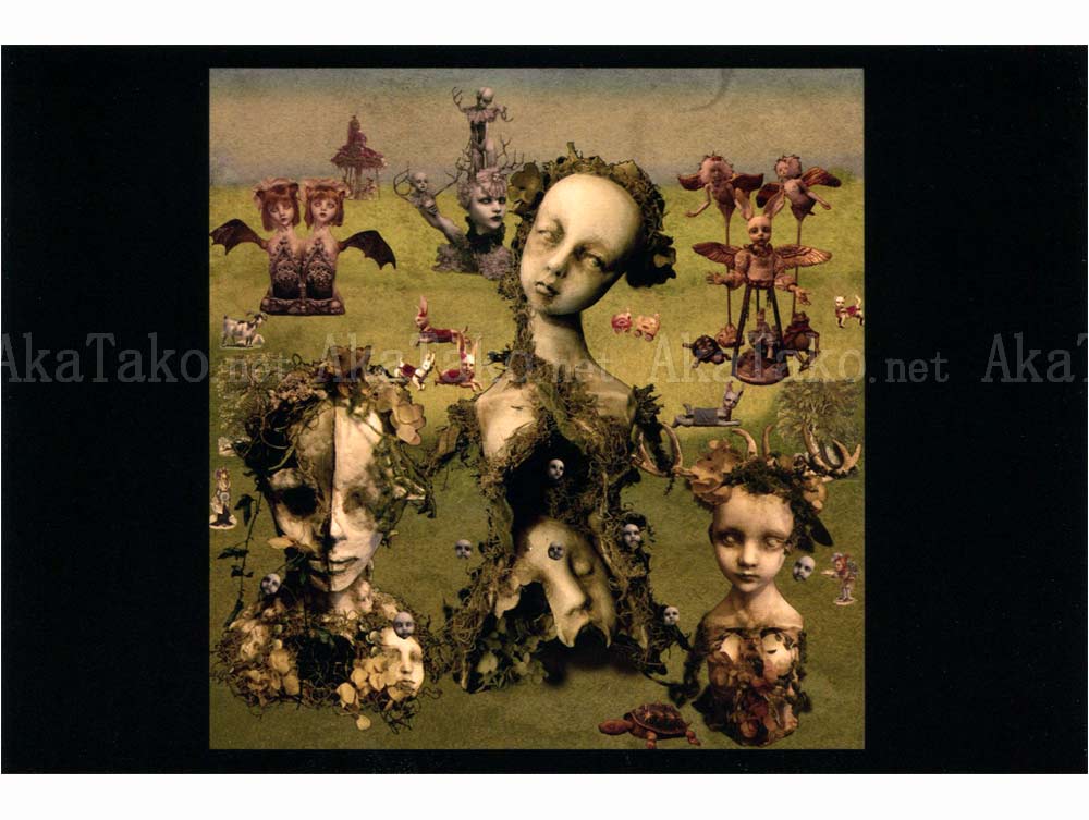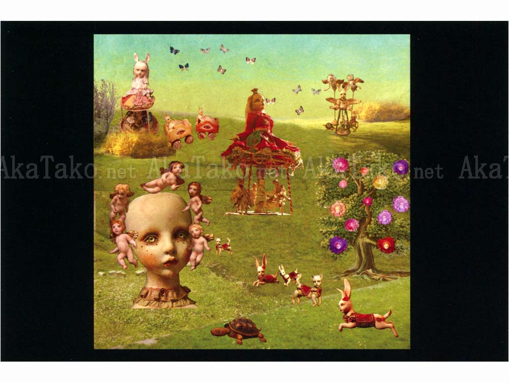Set of four postcards by Japanese contemporary doll maker Mari Shimizu. Each card features her surreal dolls - one with a cut-away torso showing small children playing on the moon and a rocking horse, one with a cut open torso showing seashells and a smaller doll (also with cut open torso), one digital composition of a hilly meadow inhabited by angels and chimeric creatures, and a digital composition of moss covered dolls torsos with broken pieces.