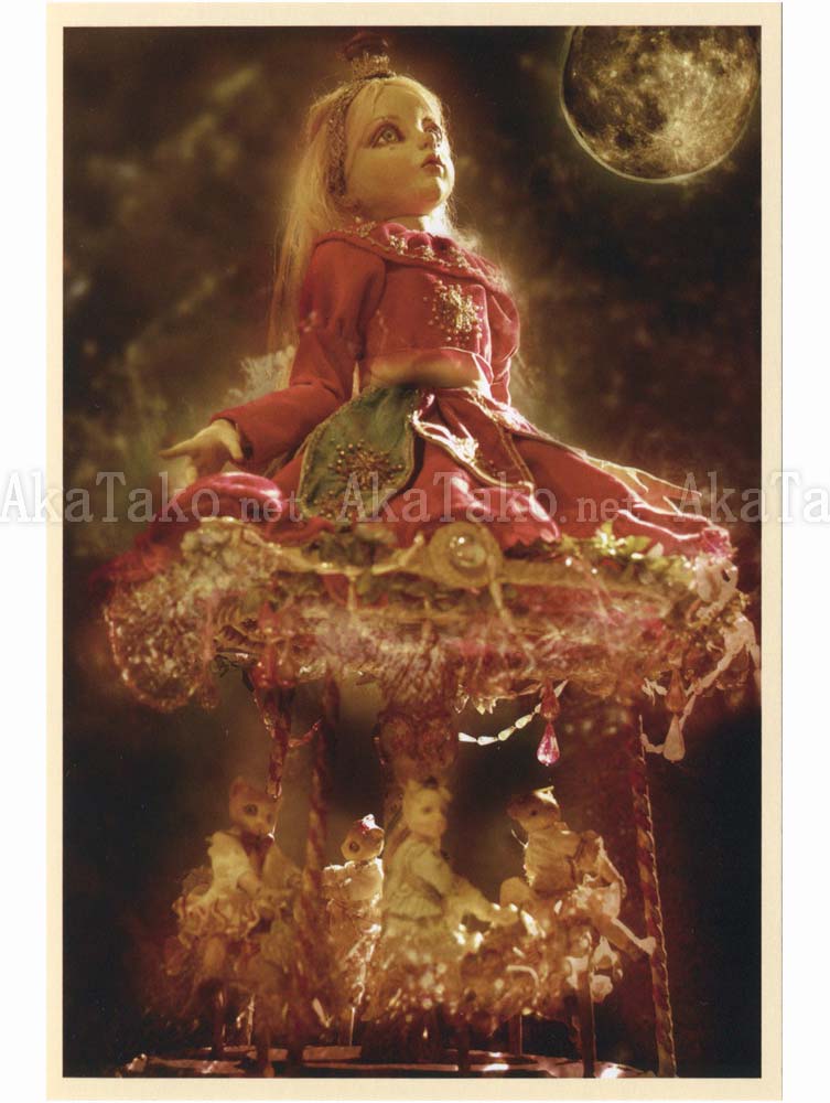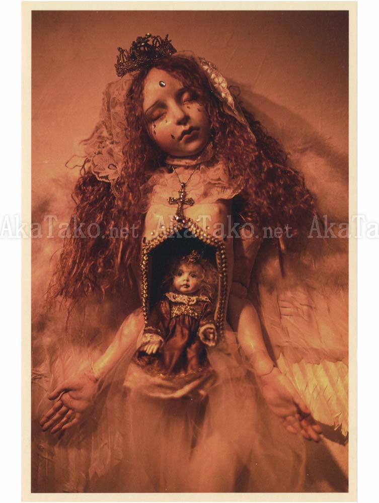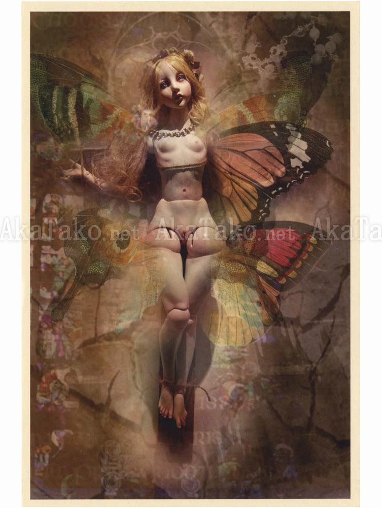 Set of four postcards by Japanese contemporary doll maker Mari Shimizu. Each card features a beautiful fantasy doll - a merry-go-round girl in pink, a girl with her torso cut open to reveal a doll inside, one in pale shades with butterflies, and a nude girl with butterfly wings.