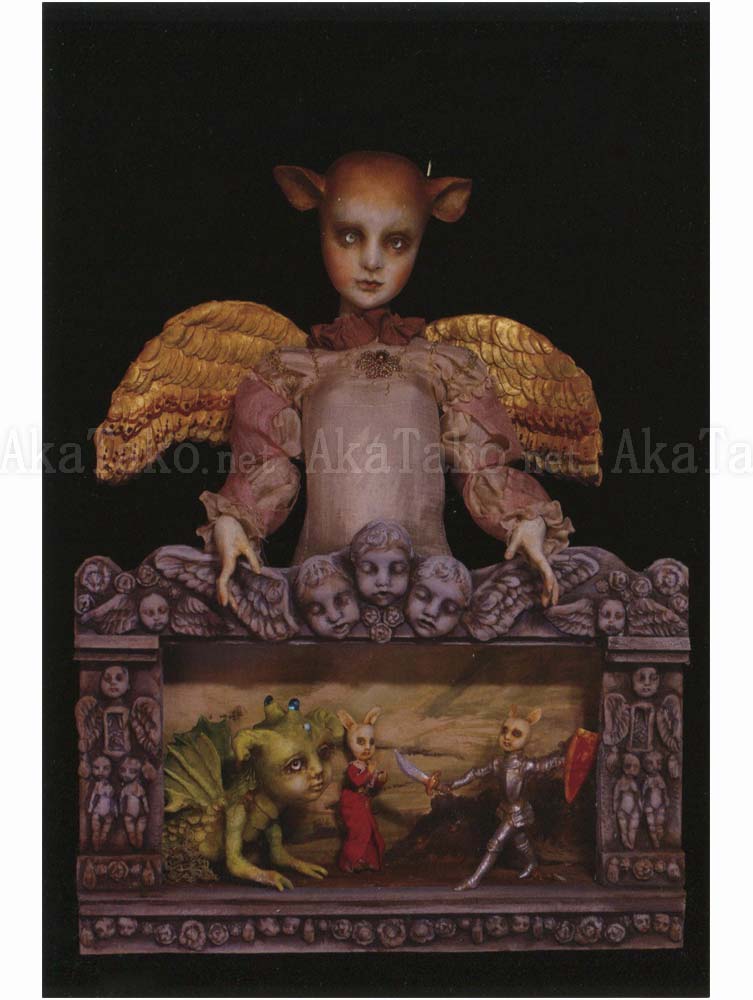 Set of four postcards by Japanese contemporary doll maker Mari Shimizu. Each card features a beautiful doll - one in a nurses uniform with cages in her torso, one holding a mask and wearing a jester's satin outfit, and two of winged dolls presiding over a dimensional shadow box scene.
