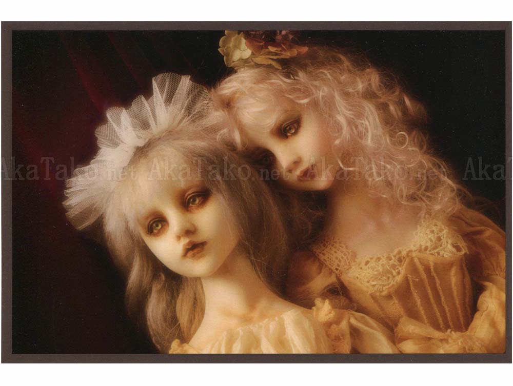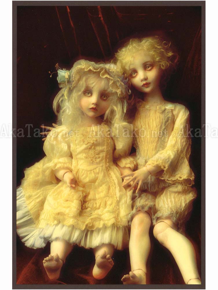Set of four postcards by Japanese contemporary doll maker Mari Shimizu. Each card features an gothic themed doll - one of two pale girls in together, one in a corset with a prosthetic leg, one in front of an altar, and two young children in ivory lace. Several of the dolls have vampire teeth peeking out between their lips.