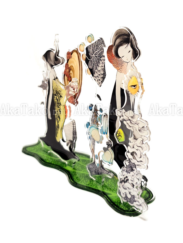 Special collaboration between Mika Nitta and AkaTako.net ! Clear acrylic art stand assembles to display your favorite artwork in a 3D layered form. "Slime Mold" artwork is previously unpublished. A special feature of Mika Nitta's acrylic stand - the pieces can be moved and rearranged on the base however you like! The connections are the same size and spacing so you can change the display many times.