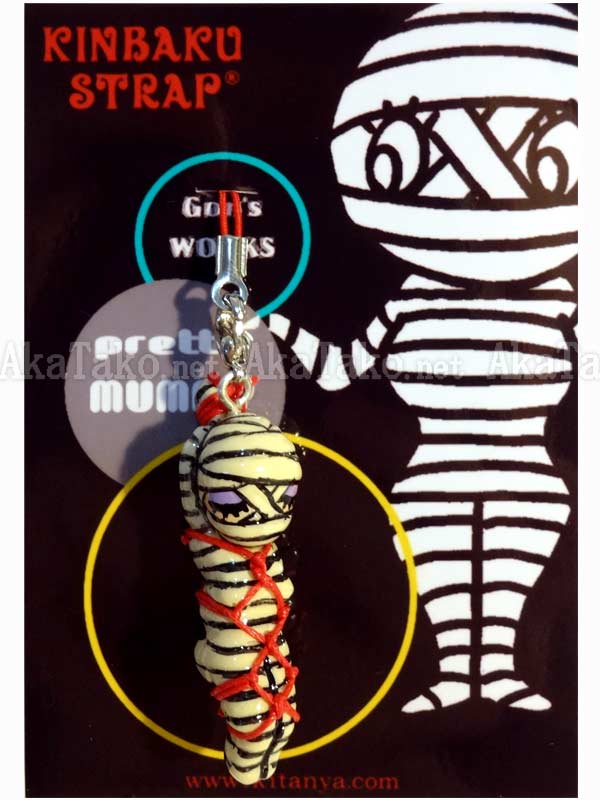 As if being wrapped in bandages weren't enough this mummy has been tied up in Japanese rope bondage too! Kinbaku cell phone strap handmade in Japan and signed by the artist (in red on back). Comes on a paper display card as shown in second photo and has a lobster claw clasp to make attachment easier.