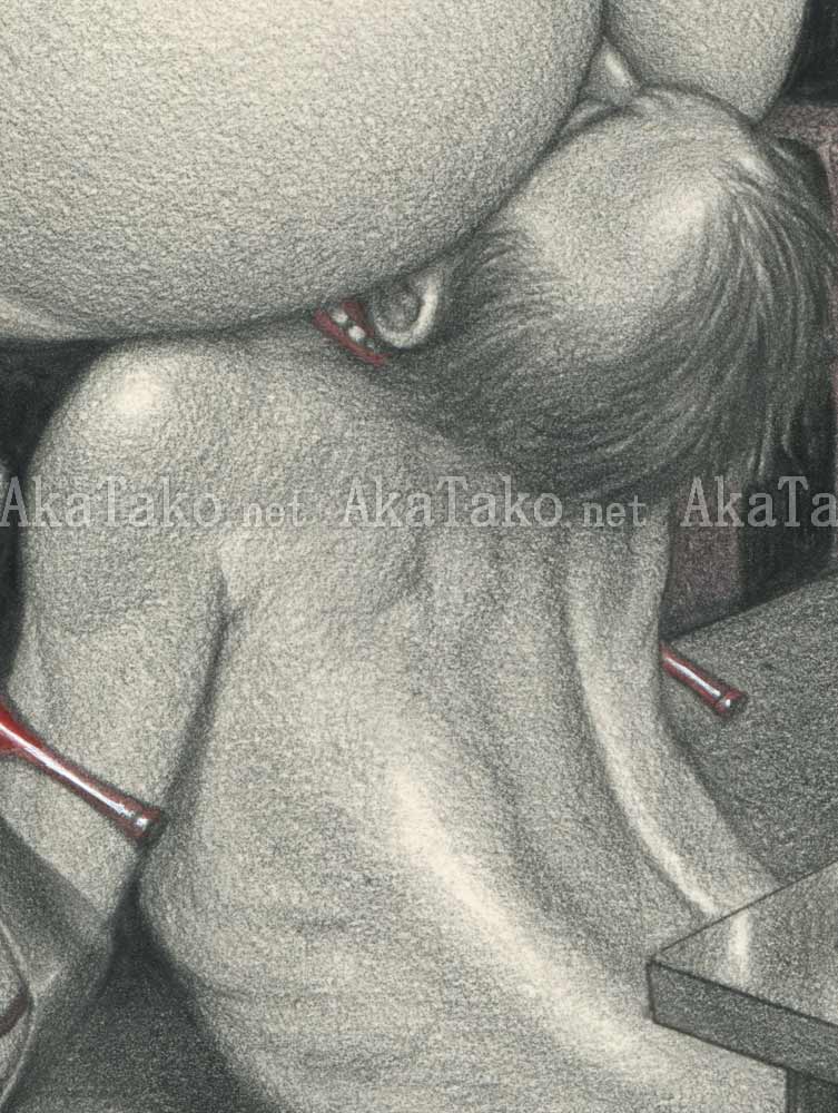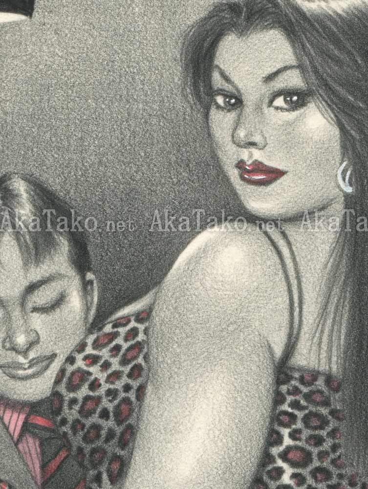Rare original drawing by Namio Harukawa with pink and red color accents. A large woman straddles a man in a suit who is sitting on a striped sofa. Her bottom is bare and the face of a small man is buried in her buttocks. The seated man holds a leash around the nude man's neck and pulls the rope tighter for a closer fit.