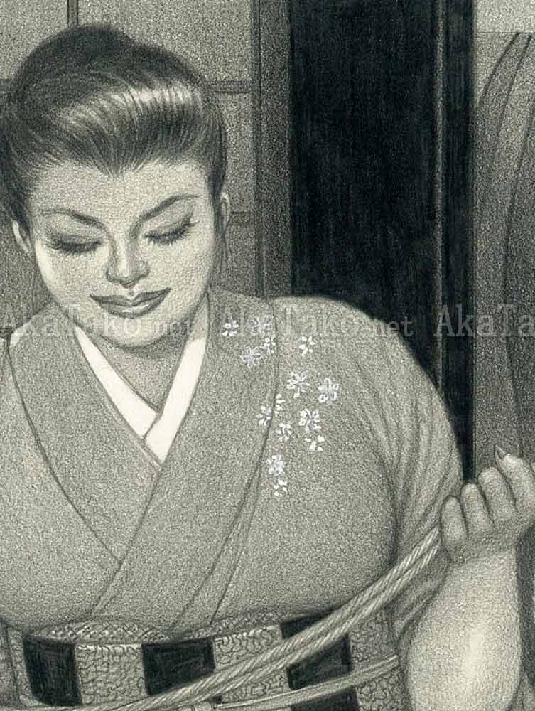 Original drawing by Namio Harukawa of a woman wearing a kimono that is pulled up to her waist. She kneels on the tatami floor and pins a man below her with only his face visible at her crotch and his hands peeking out at her knees. She holds a rope in her hands.