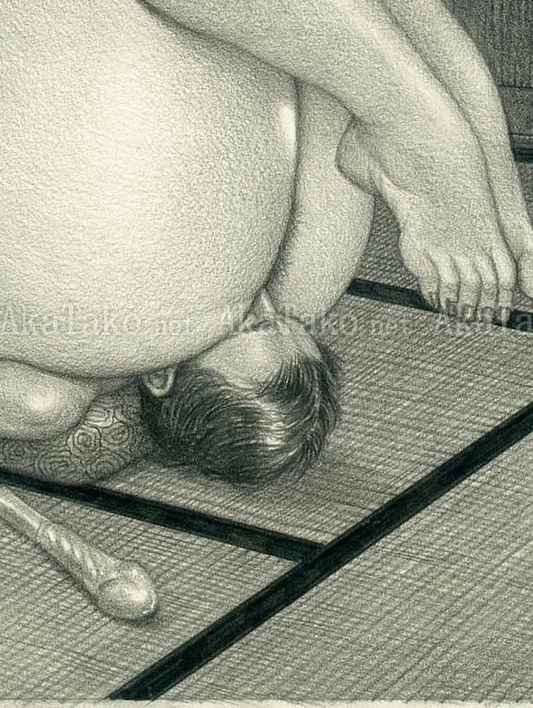 Original drawing by Namio Harukawa features a woman with her kimono on her shoulders. She reclines on a chair with a nude man tied to it so that she may sit on his face.