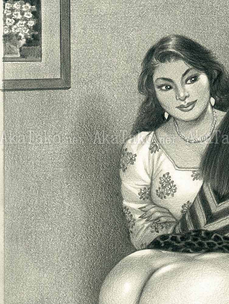 Original drawing by Namio Harukawa features a woman with her skirt pulled up to her waist. She is seated on a wooden stool which has a kneeling nude man tied to it so that his face is buried in her buttocks. A fully dressed woman looks on in the background.