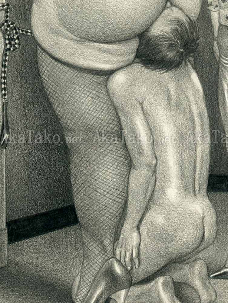 Original drawing by Namio Harukawa features a woman wearing only a shirt, stockings and heels. She stands facing the wall. Behind her is a nude man whose neck has been tied to a column forcing his face to be buried in her buttocks. A shorter woman looks on.
