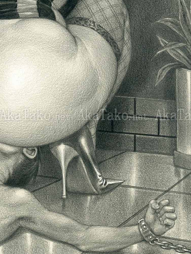 Original drawing by Namio Harukawa of a woman wearing a striped shirt, stockings, and high heels. She squats onto the face of a nude man who is bound in chains at his wrists.