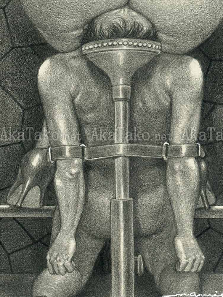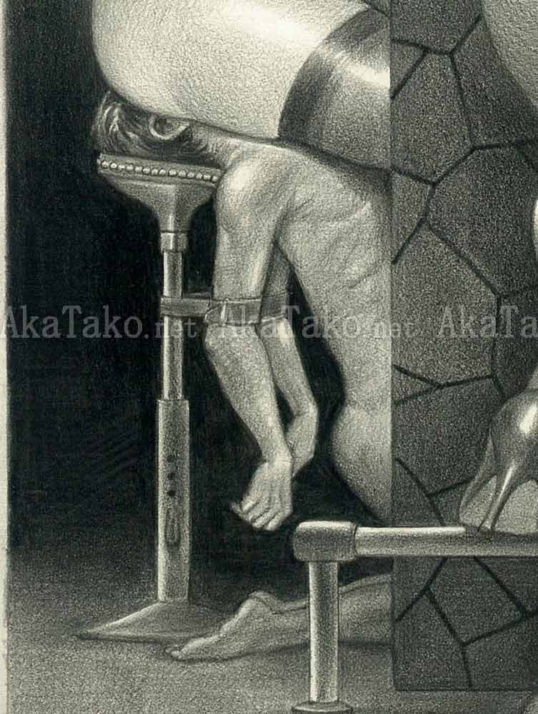 Original drawing by Namio Harukawa of two women enjoying a drink at the bar. Both of their skirts are raised to their waist and they sit on a special stool. A kneeling nude man is bound to the stool by his arms and his face is the seat - lost in the women's buttocks.